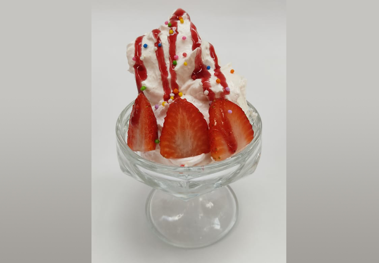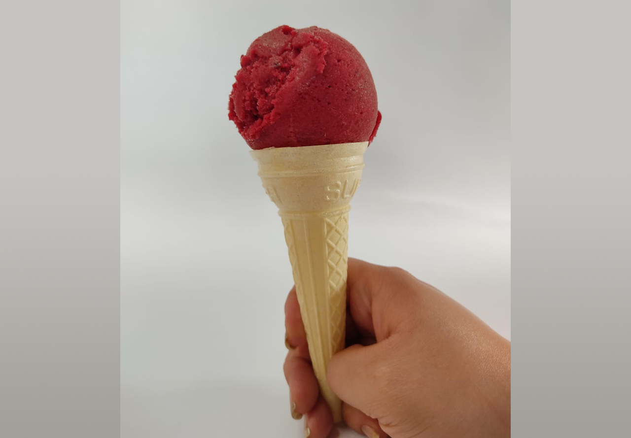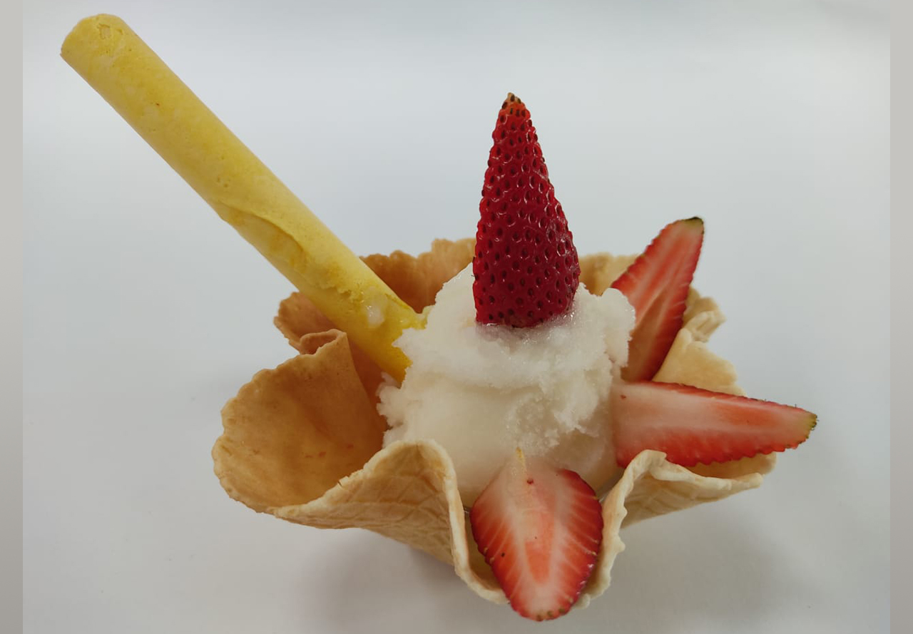 Helado de paila 100% fruta en tulipán con frutilla y barquillo.
