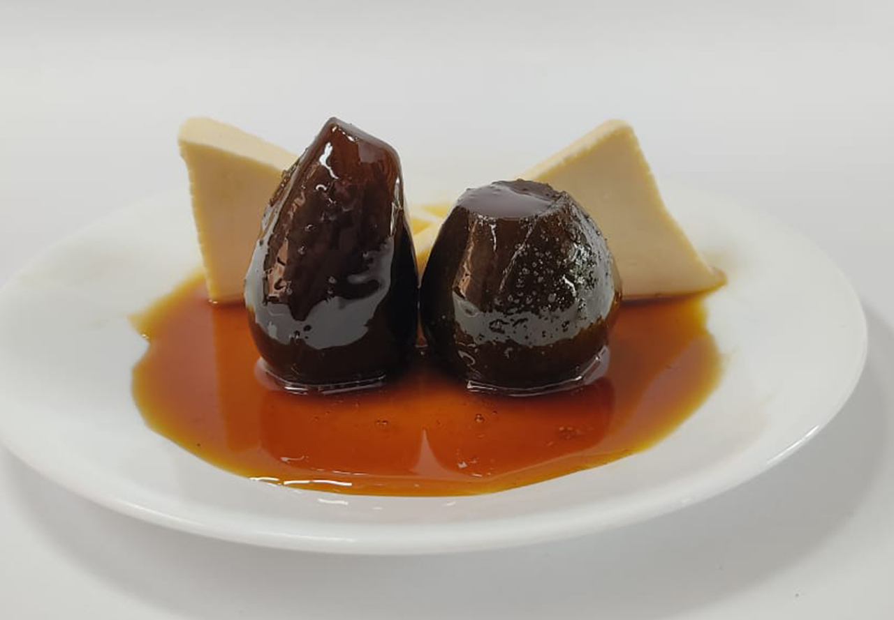 espumilla artesanal de guayaba con frutillas y sirope de mora.